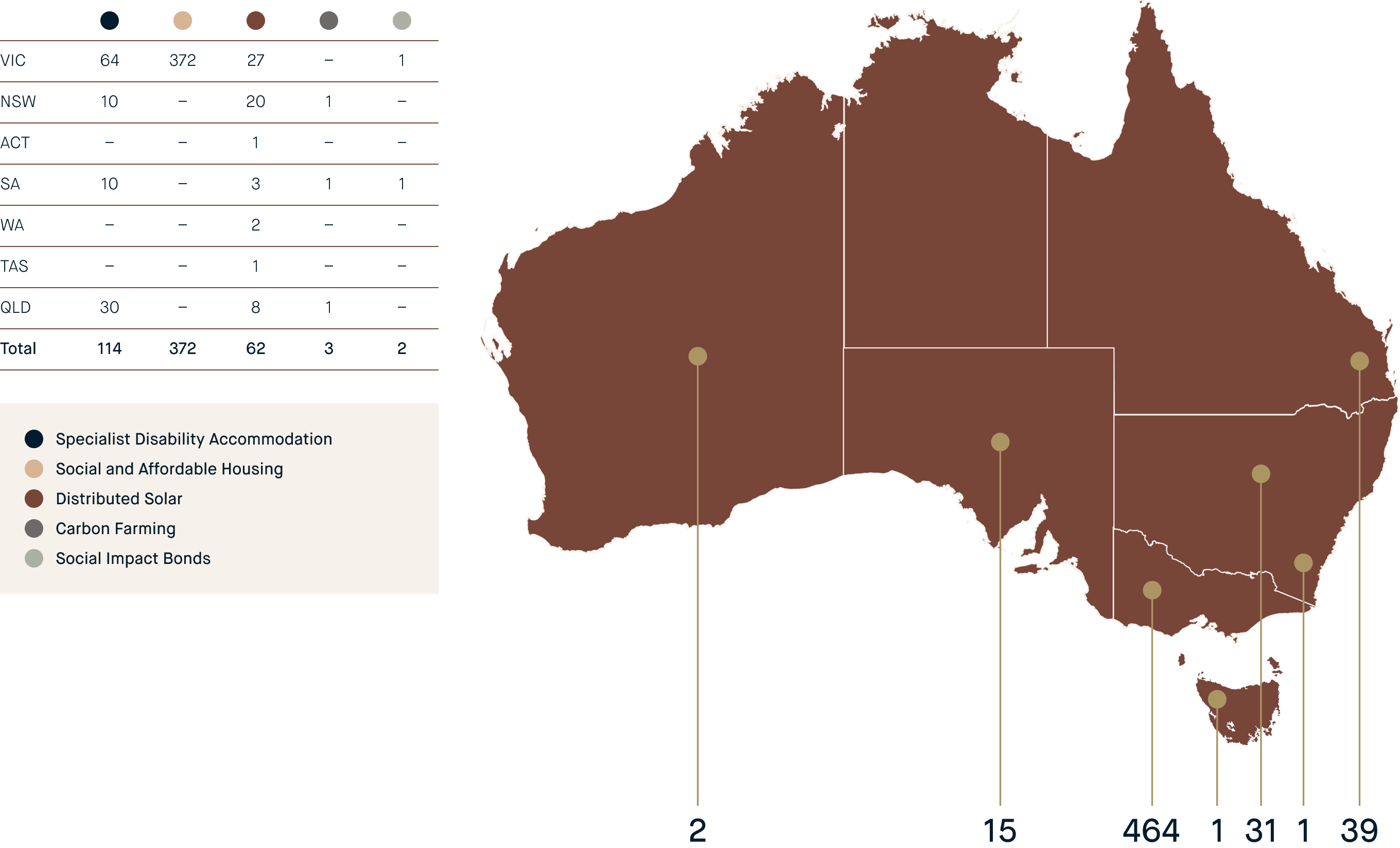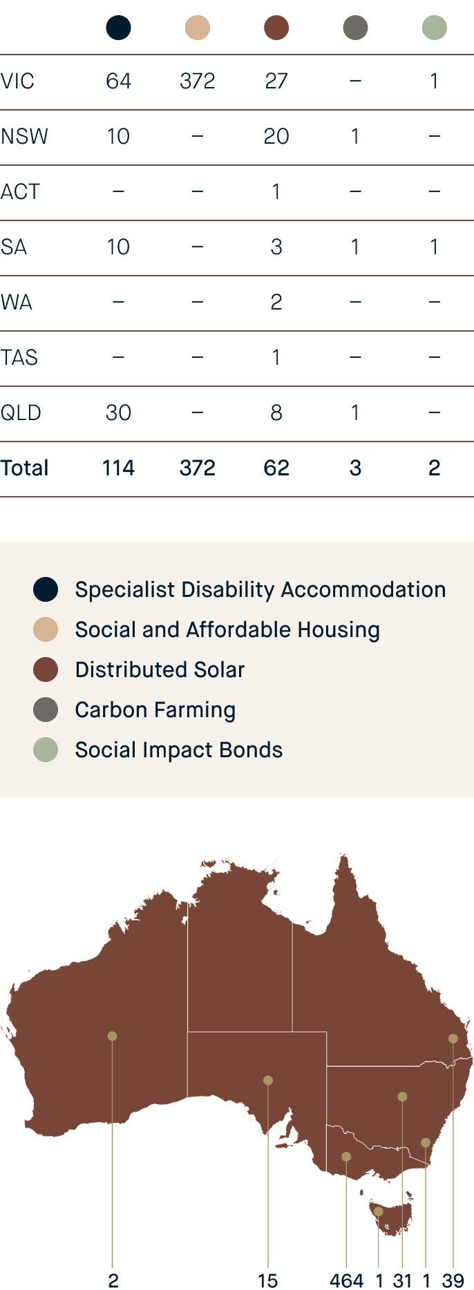 Our funds have invested capital in a range of sectors – including social and affordable housing, Specialist Disability Accommodation, renewable power, carbon farming and social impact bonds.